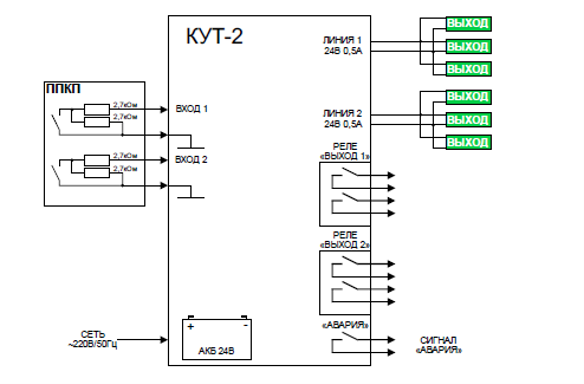 Контроллер управления табло КУТ-2 - это пожарный прибор управления, предназначенный для автоматического включения, питания и контроля исправности световых пожарных оповещателей и эвакуационных знаков («Выход», указатели направления и др.) в составе системы оповещения и управления эвакуацией (СОУЭ).